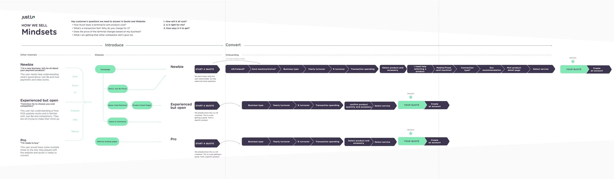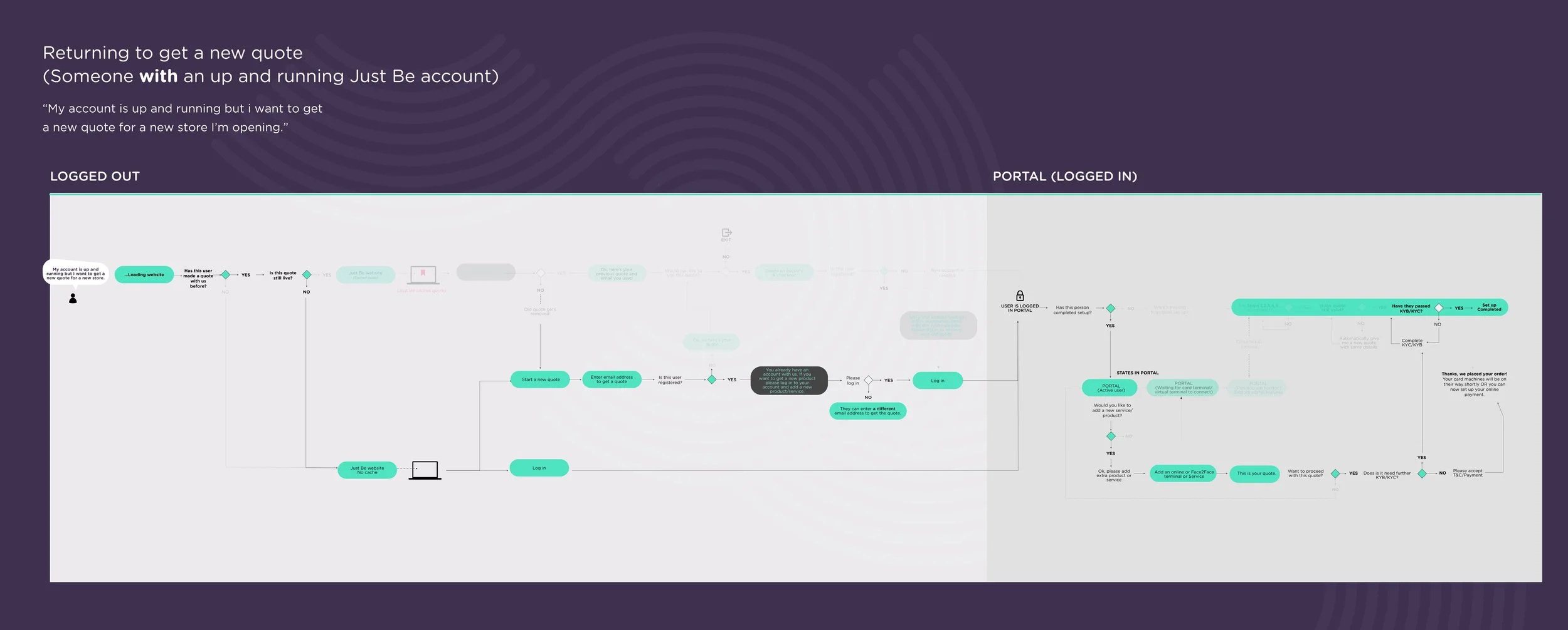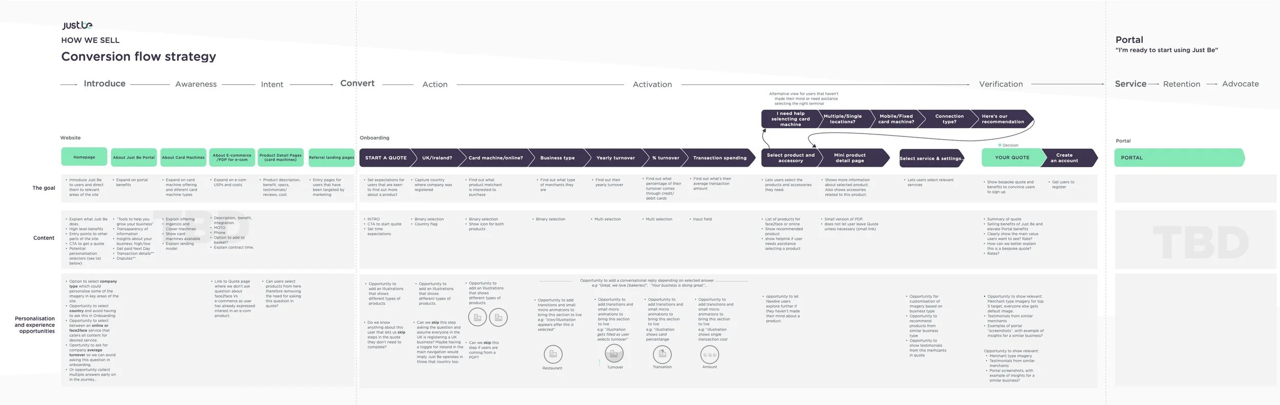As part of product definition, I created strategy maps that helped R/GA and the business team at Just Be, guide the design of different areas in the platform; from introduction of the product to new businesses, to conversion and retention for different customers mindsets.