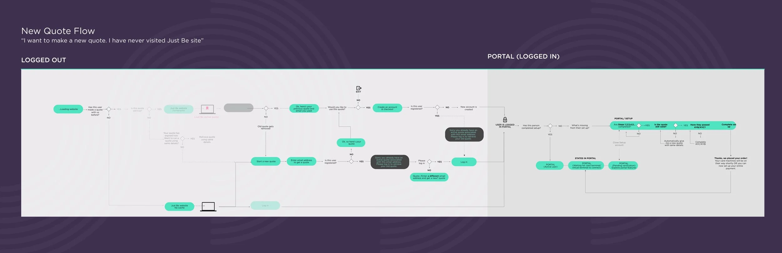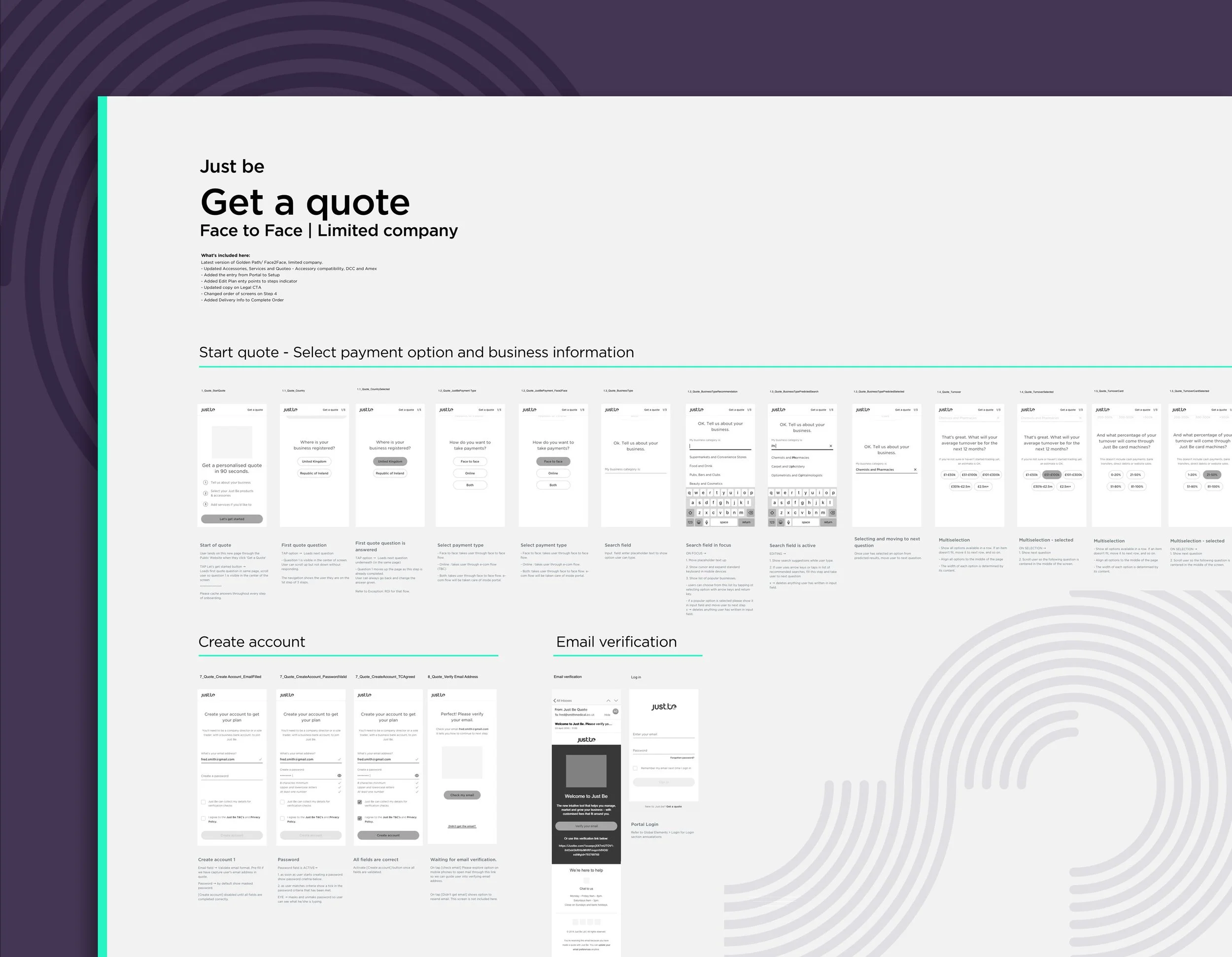 Each user type had a onboarding/set up journey that needed to be mapped out. Sole traders, limited companies, ROI, each had a screen flow mapped out for scenarios such as getting a new quote, returning to retrieve a quote, company authentication and errors. In addition to these, wires for account management and checkout screens were produced.