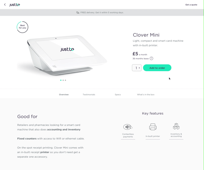 While defining the behaviour for Product Detail Pages, user needed to be able to add potentially multiple products to the basket. We came up with a solution that added all items in a persistent order summary at the bottom of the screen, so users could navigate through checkout order with a consistent place where to store payment devices and accessories.