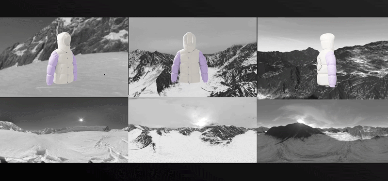 Using HDRI images (360 picture that wraps around an object) , we started playing with the concept of being able to move the backgrounds while user rotated the jacket as opposed to just keeping a static flat image in the back. We used Moncler’s iconic black and white mountain photography to give more emphasis to the product colourful configuration.